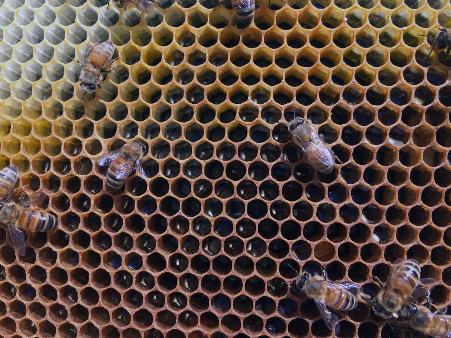 Since my last inspection, the workers have not only drawn comb on the two empty frames I put in the hive to replace the two frames of honey that I transferred to Hive Acquitaine, but had also filled that comb with honey. They are actively working on solidifying an amazing amount of honey for winter stores. Given the warm weather, they will likely have not only replaced but increased the amount of honey stores in the medium box.