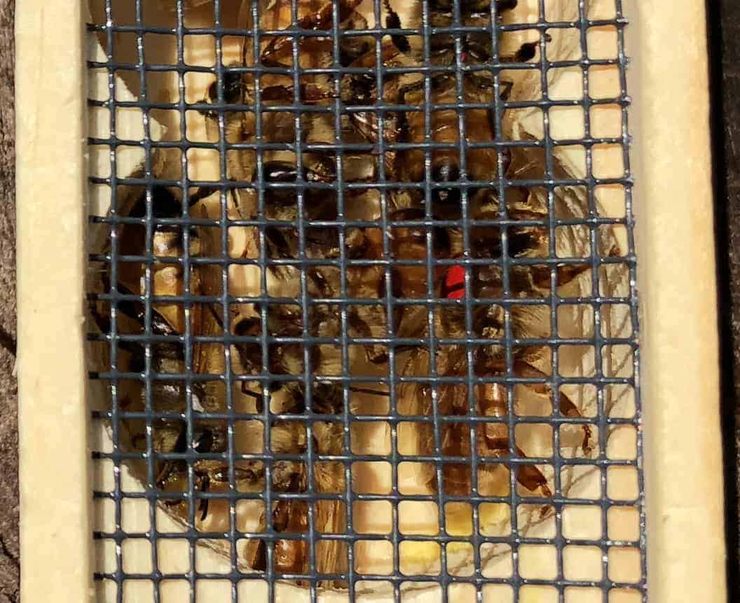 I decided after some well-placed advice to re-queen that colony with a new queen prior to letting it depart my apiary. I located and installed the new queen and had my purchaser wait until I was sure she had been released before picking up the colony. Once I knew she was released and active in the colony, I packaged up the nuc for him.