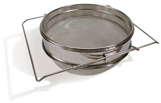 Hint: place this double sieve below your extractor’s gate during extraction and filter the honey as it comes out. Keep two sieves on hand, and switch them out frequently to clean. Then let your honey settle before bottling.