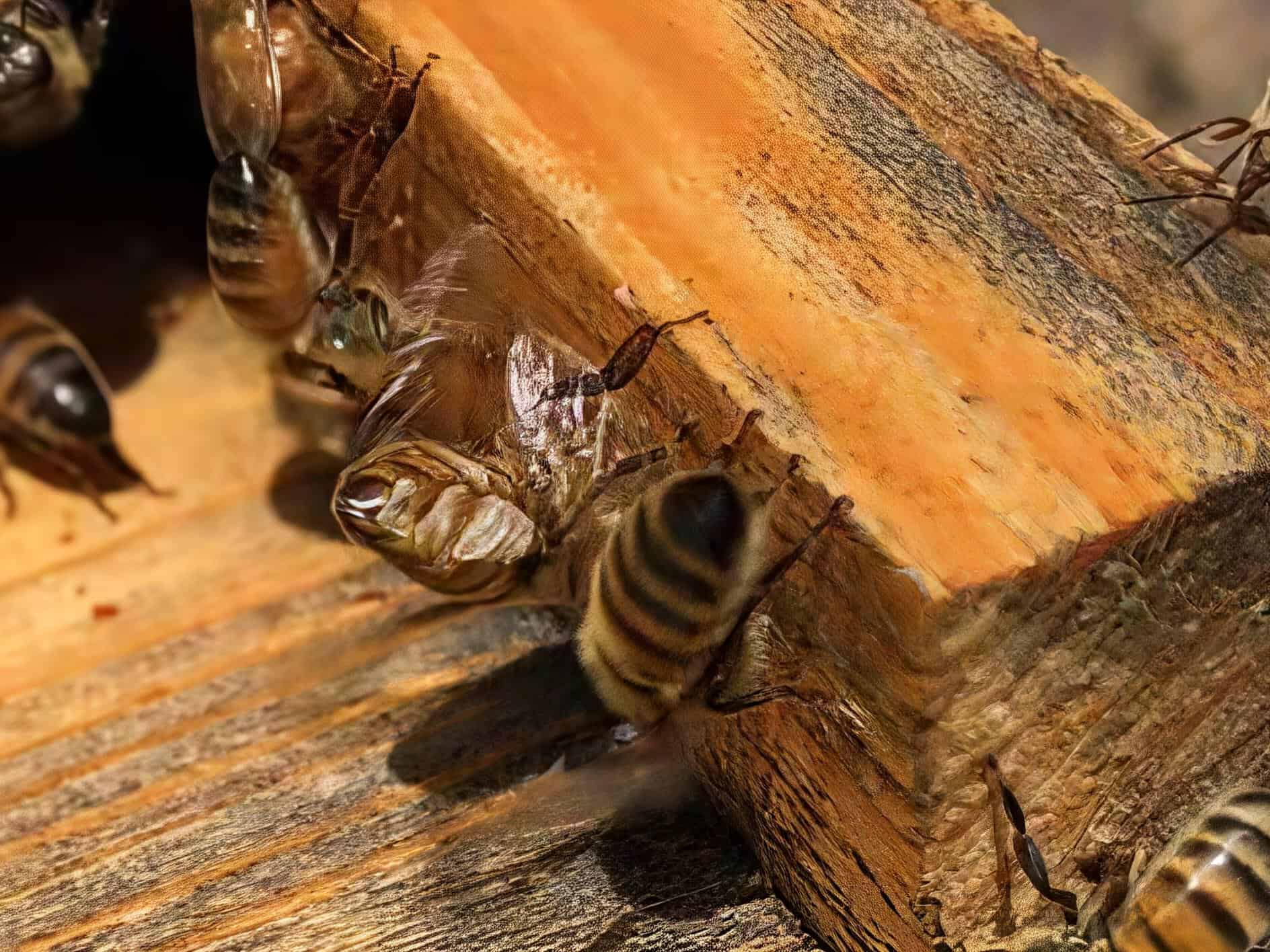 Worker honeybees aged 6-12 days are the primary beeswax generators in a beehive, they are the only bees with the specialized glands needed to produce it. There are 8 pairs of these glands on their abdomen that convert nectar into tiny wax “scales” (see image below). Bees then use their legs to grab the scales and move them to their mandibles to be chewed and mixed with saliva so the wax is soft enough to use as building material inside their hive.