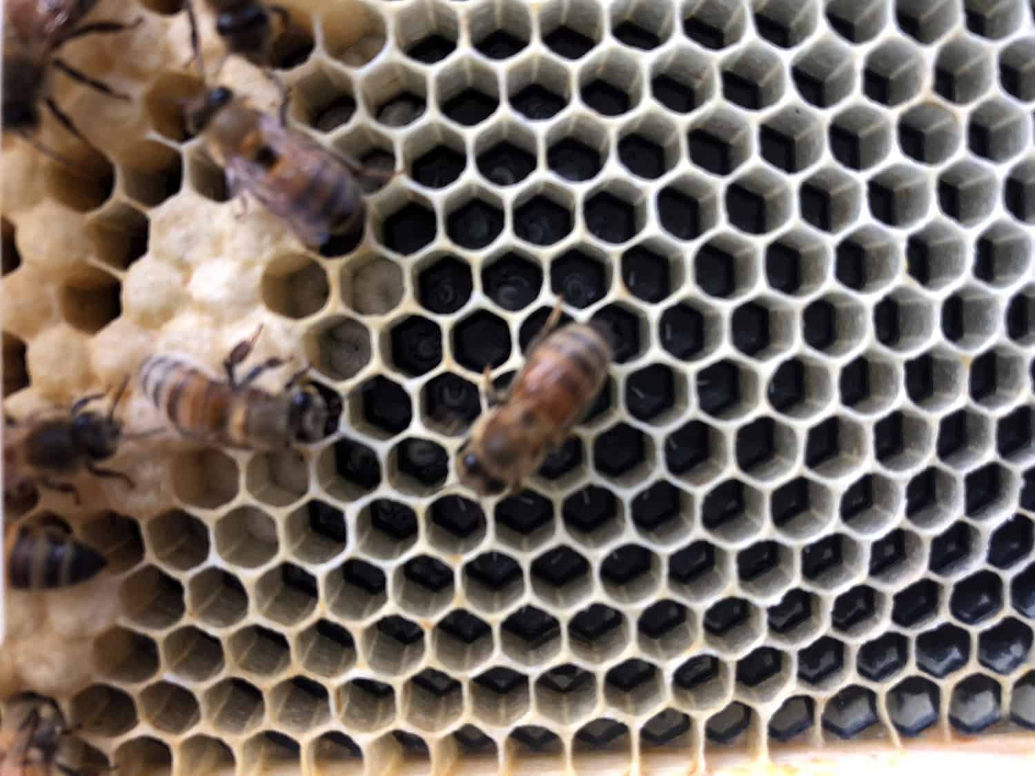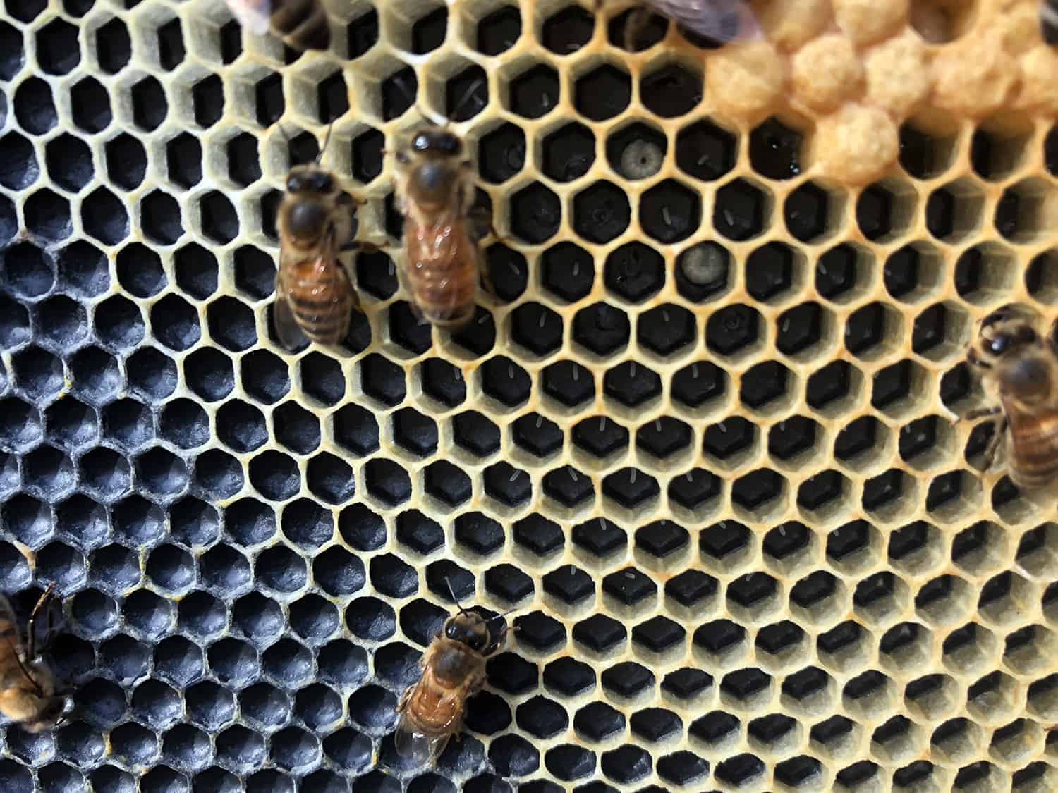 The four frames with a combination of capped brood, eggs, larvae, and Ceridwen made up the core and center of the deep brood box for Hive Wales.