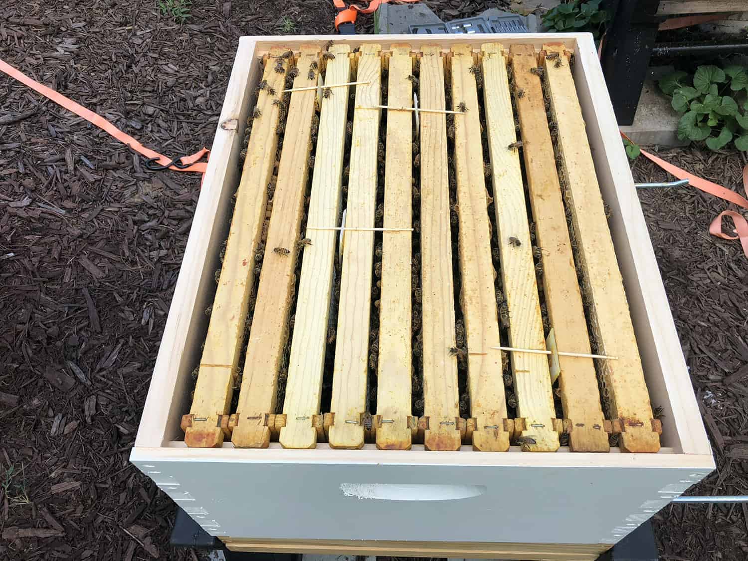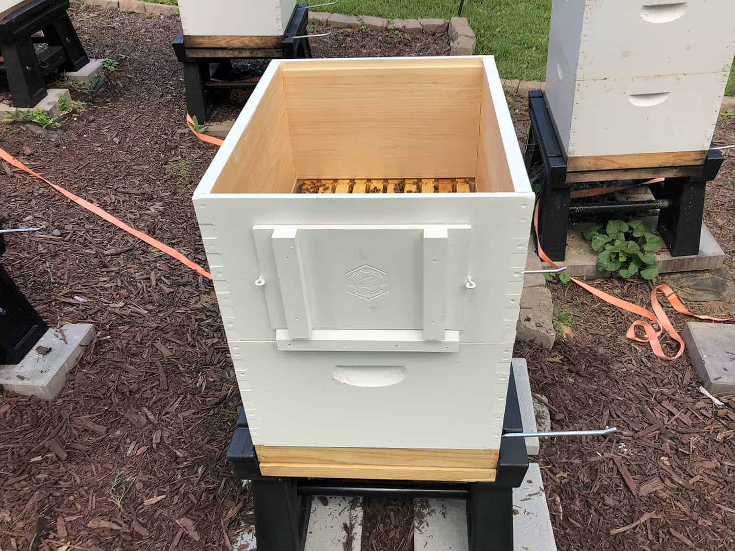 With the bottom deep box in place, I could begin transferring the nuc’s frames into place.