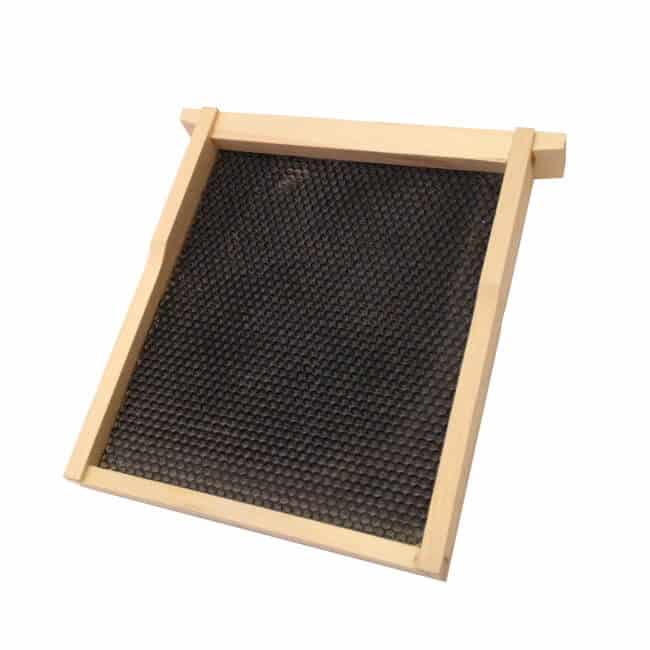 An assembled half frame with black, heavy wax for use in a queen mating nuc.