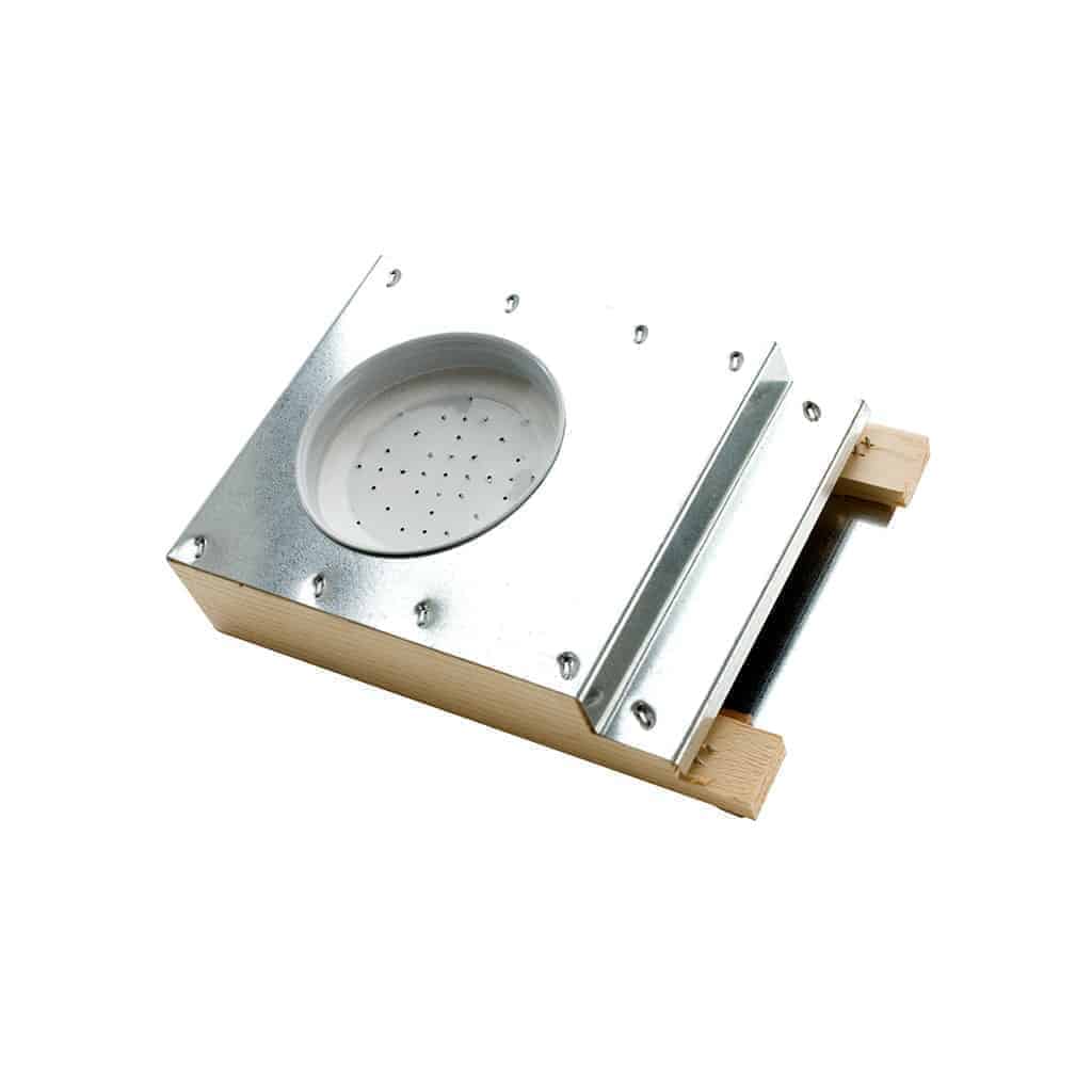 Often referred to as Boardman Feeders, entrance feeders are placed at the entrance to the hive. They are easy to use, monitor and refill. The downside is that they are placed outside the hive and the bees will not be able to use them after temperatures drop to the low 50’s. They also tend to encourage robbing and don’t hold very much syrup compared to other feeders. For these reasons they are often shunned by experienced beekeepers unless used as a water source for the colony.
