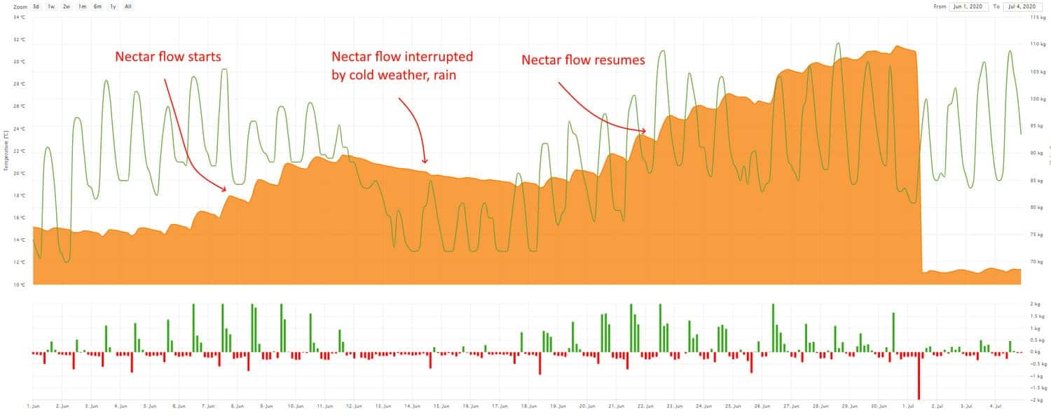 - Tracks the weight of a hive helps determine when hives are healthy and enjoying a good nectar flow (weight increasing) or when they are potentially unhealthy and/or are not collecting nectar (when the weight is constant or decreasing).