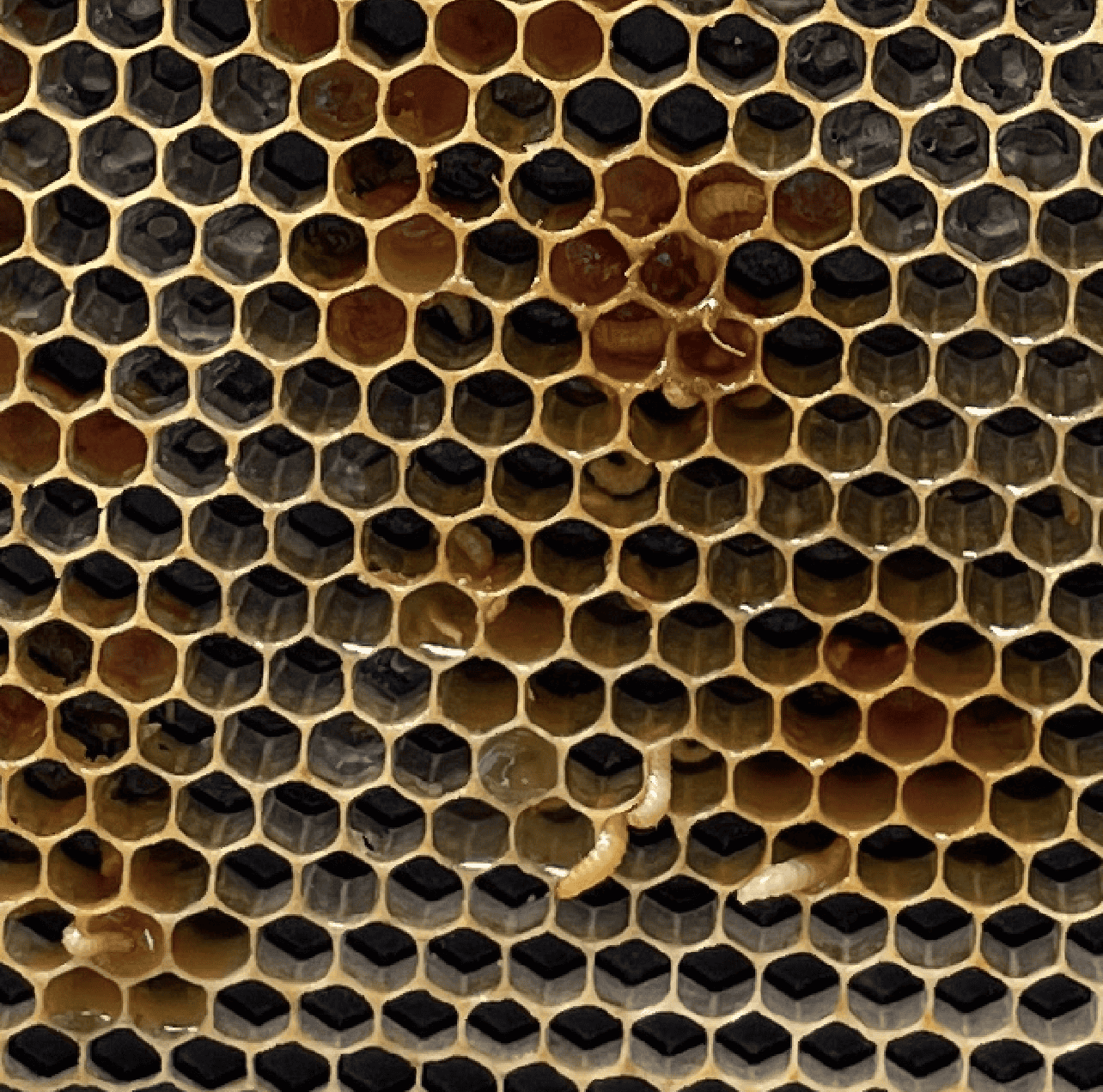 SHB larvae feed on pollen, honey, AND developing bee brood. In this larval stage, they will get around the hive to feed by tunneling through honeybee combs, ruining & making a mess of any comb, stored honey, or pollen they encounter.