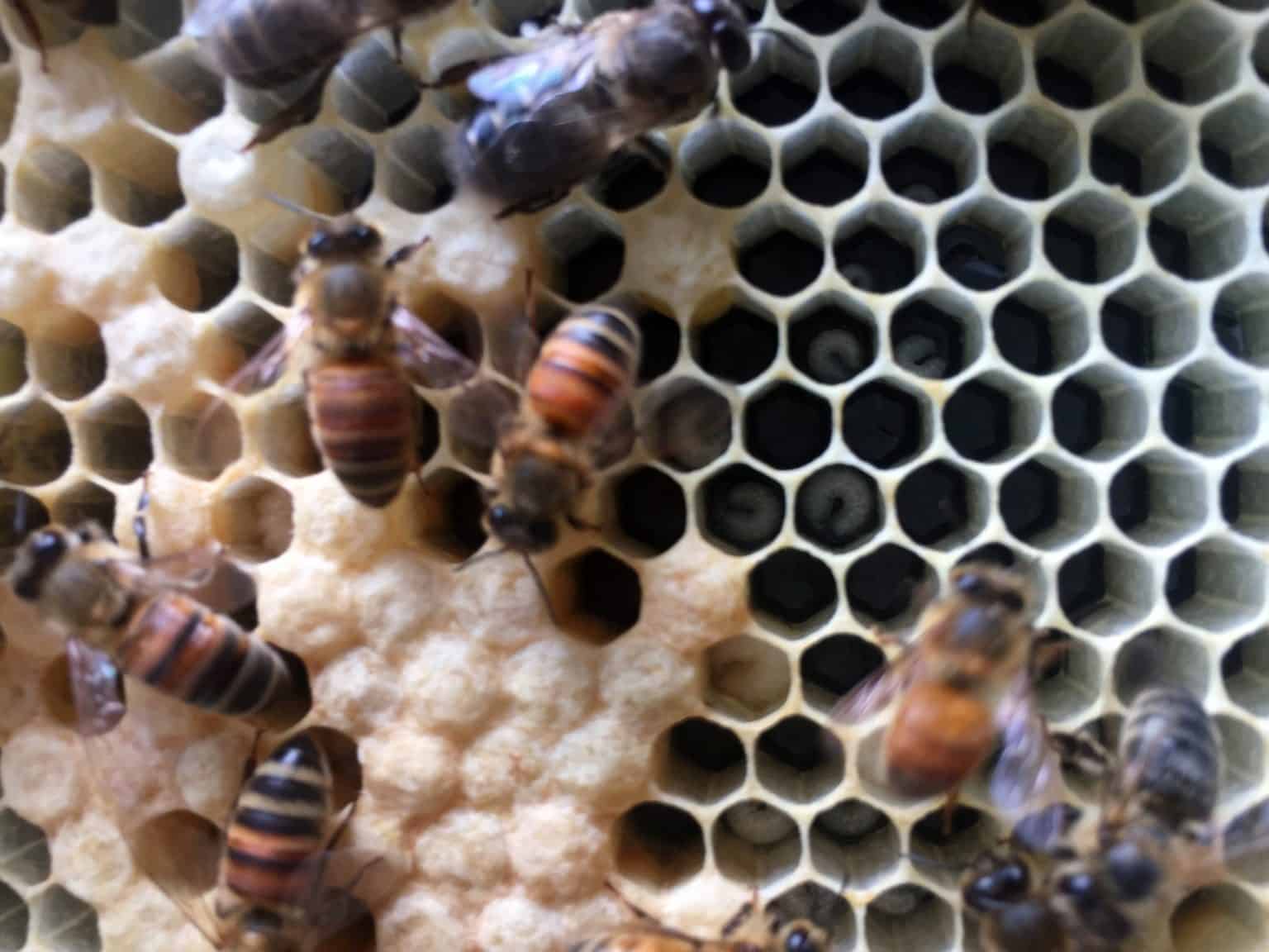 Despite the robbing, the colony came through the process exceptionally well.  The workers have already put to good use the two frames of brood transferred from Hive Acquitaine.  Two of the young larvae are being fed to become queens.  So with one capped cell, which I have doubts will emerge, and now two uncapped cells.