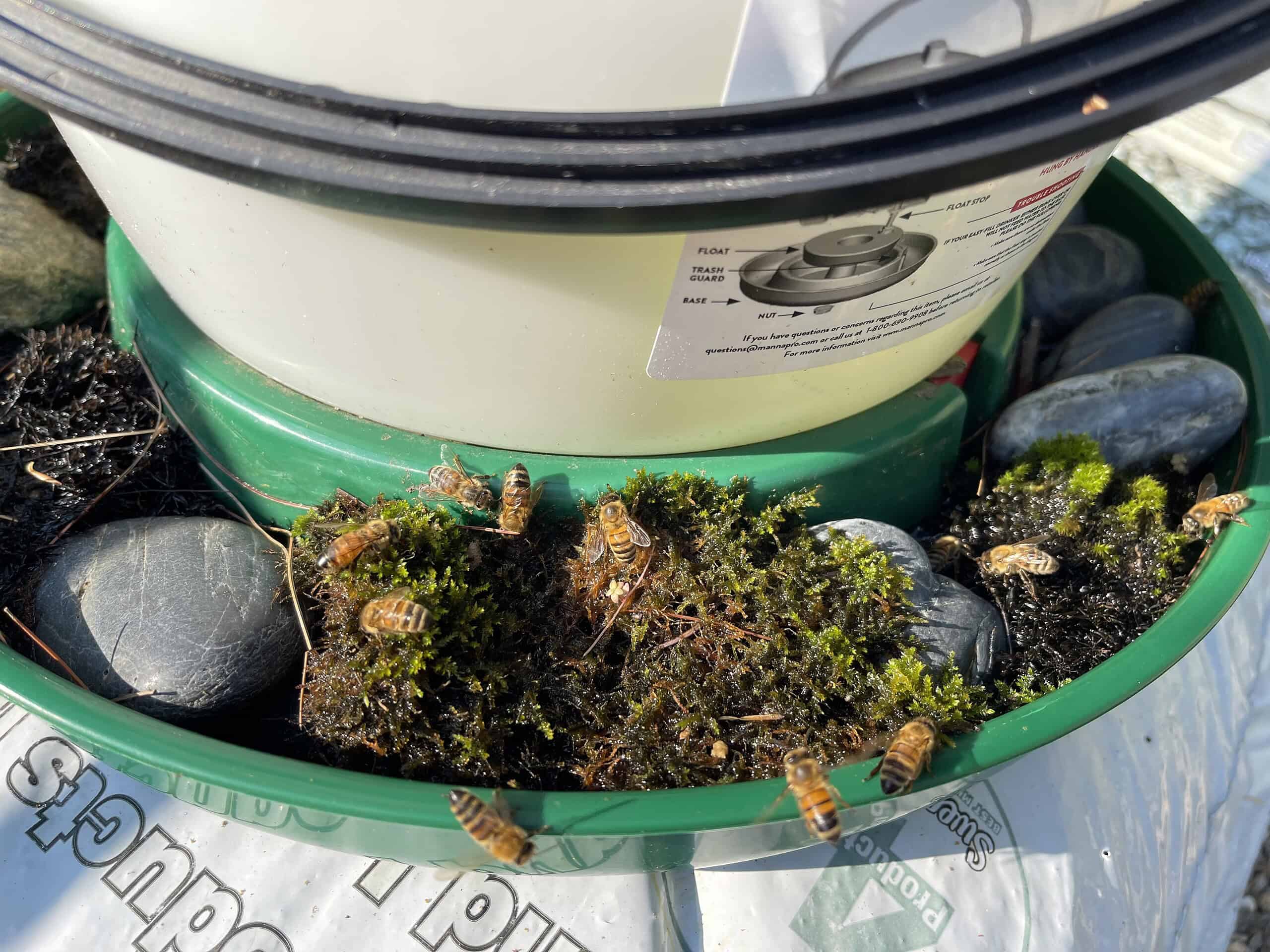 In some extremely dry conditions, adding a water source that’s close to the hive’s entrance may provide some much-needed aid to your bees who can’t actively forage. Any water should be provided in a shallow dish to ensure bees do not drown, and moss and/or dark-colored pebbles can be added to help keep water from freezing in extra cold conditions. (See image below) Take Caution! Water should only be provided if it can be done without disturbing the cluster.