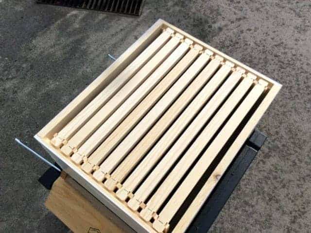 Next, you need to fill the deep box with frames.  When you are positioning the frames in the box, you need to ensure that you respect bee space.  If you are filling a ten-frame deep or medium box, make sure that you have the frame spacing correct or your bees will fill the extra space with burr comb.